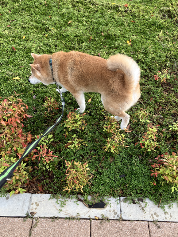 ポチくんが植え込みの匂いを嗅いでいる様子は「秋のお散歩」って感じでいいですね!!!