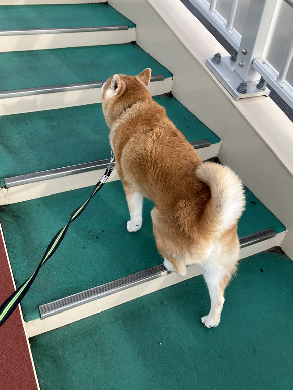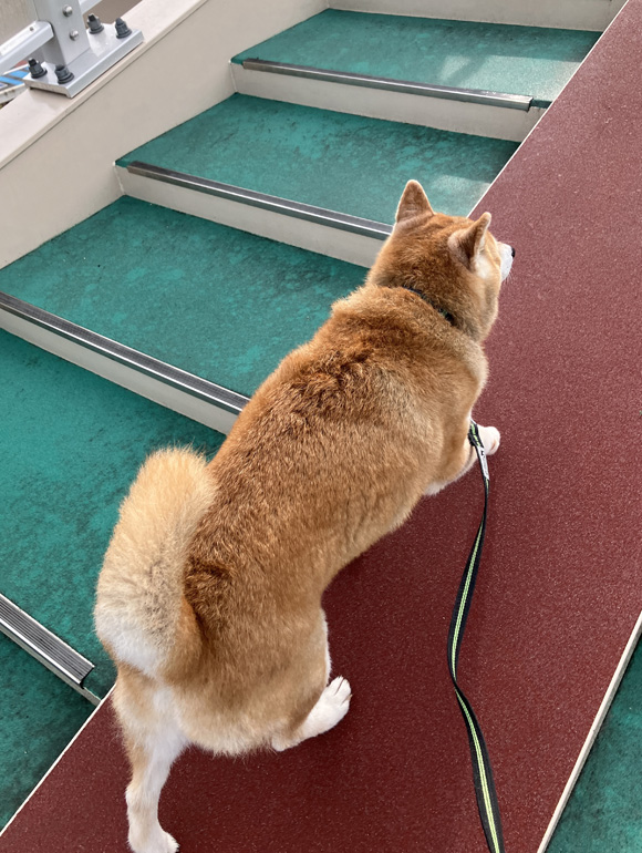 ポチは最初は階段を上り、途中から自転車用の斜面を上りました。