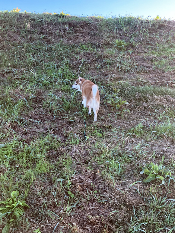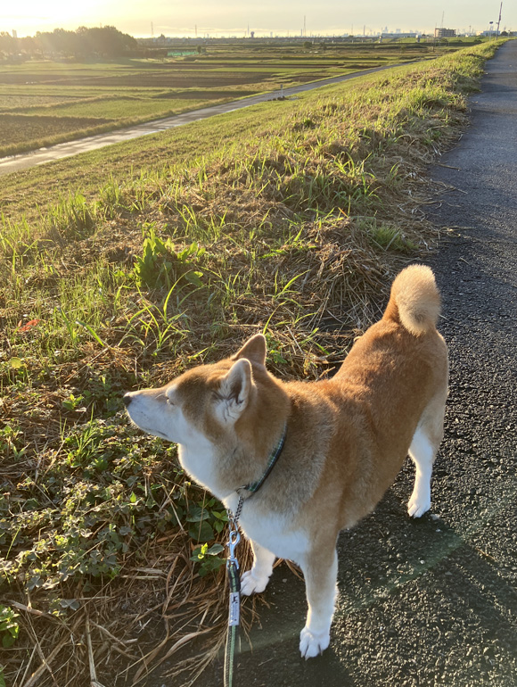 ポチも早足で堤防を歩いたかと思えば、途中で立ち止まって、気持ちいい空気をじっくりと味わっているような表情を見せました。