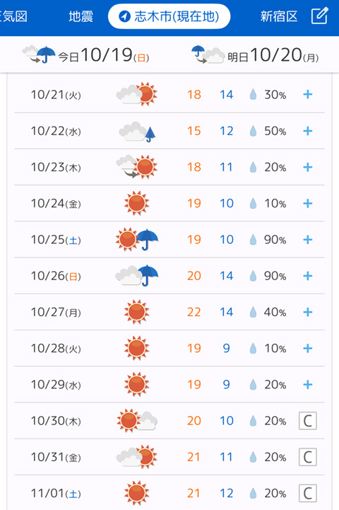 この先、雨の日も何日かあるようです。晴れるのは10/27以降ですね