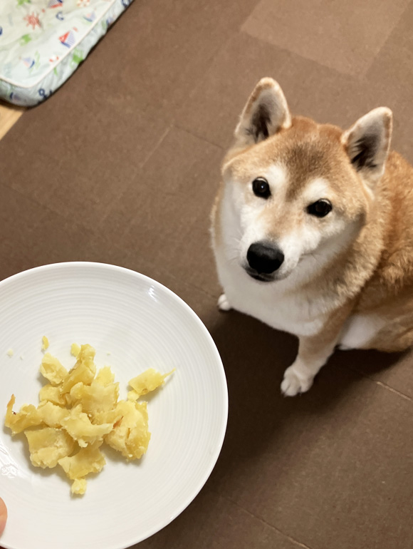 今日は夕食後に、ポチと一緒に焼きイモを食べました。イモは千葉県産のシルクスイートです