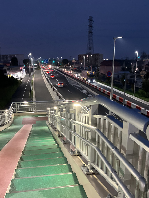 ここの歩道橋は夜も明るいので、安心して犬も渡らせることができます