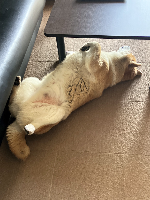 ポチもさすがに疲れたのか、朝食後すぐにヘソ天で寝ていました。