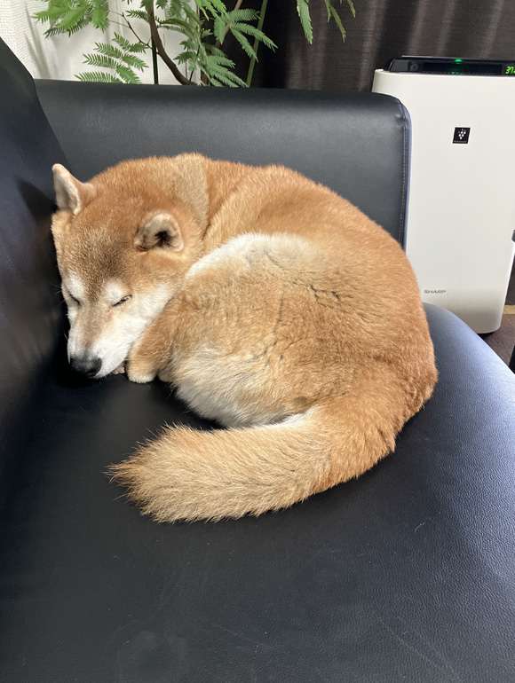 今日は12月ころの寒い日になりました。暖房は入れていましたが、ポチはソファで丸まっていました