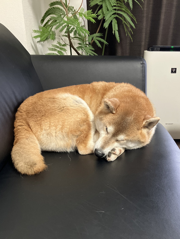 今日は12月ころの寒い日になりました。暖房は入れていましたが、ポチはソファで丸まっていました