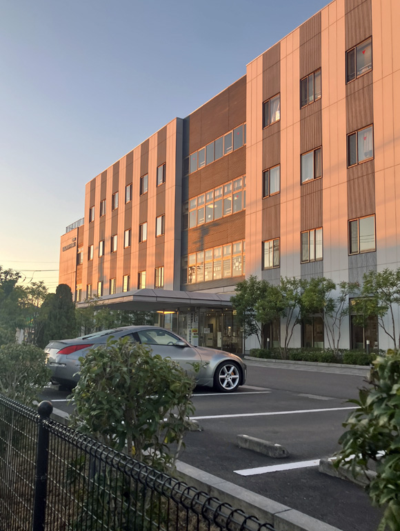 今朝は病院の周辺を散歩しました。白い建物が、朝日で赤く染まっていました