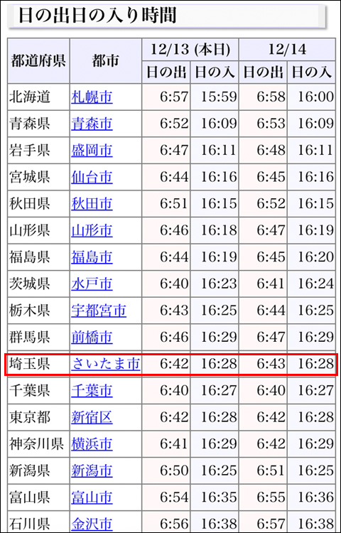 東日本の主な都市の日の出、日の入り時刻。今日のうちの地方の日の入りは16時28分。札幌では16時前には日が沈んでいるのですね