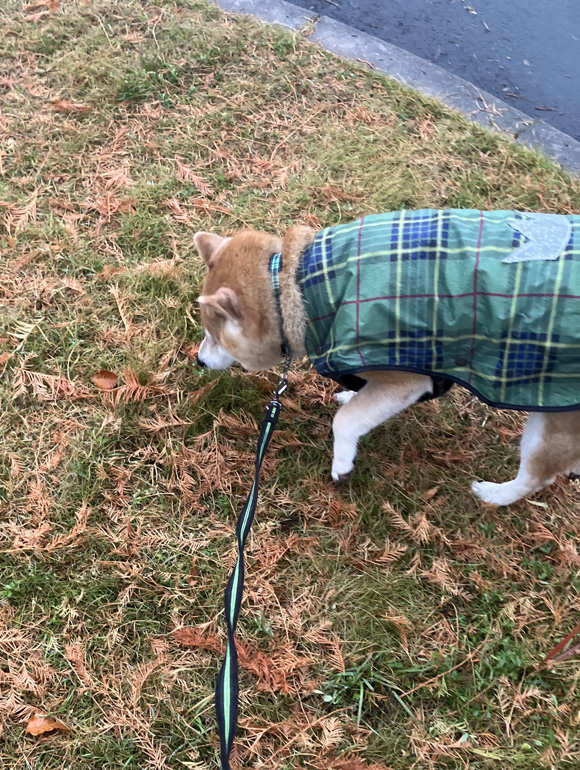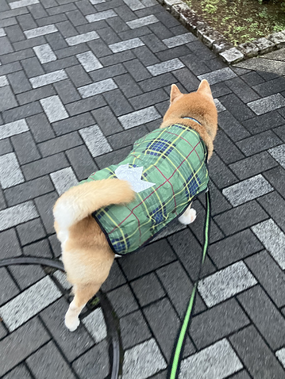 これくらいの弱い雨だと裸で出かけるのですが、先週、シャンプーをしたばかりなので今回は着用させることにしました。