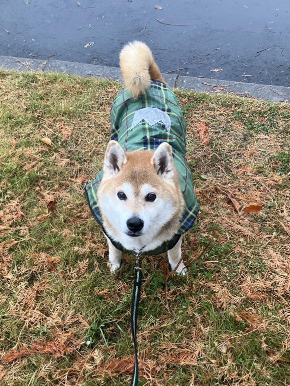これくらいの弱い雨だと裸で出かけるのですが、先週、シャンプーをしたばかりなので今回は着用させることにしました。