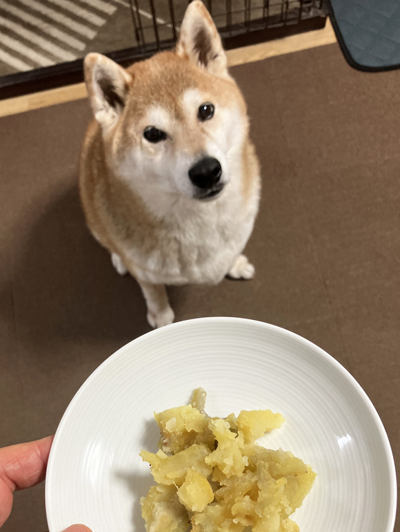 今日は帰りにスーパーで焼きイモを買ってきて、夕食後にポチにあげました。