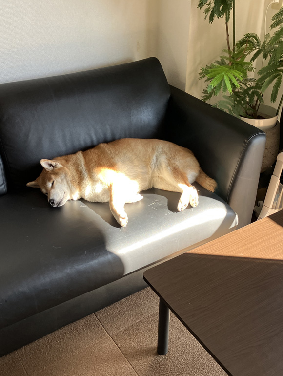 そして、朝食後は陽の入るリビングルームで、ポチは日向ぼっこを楽しんでいました。