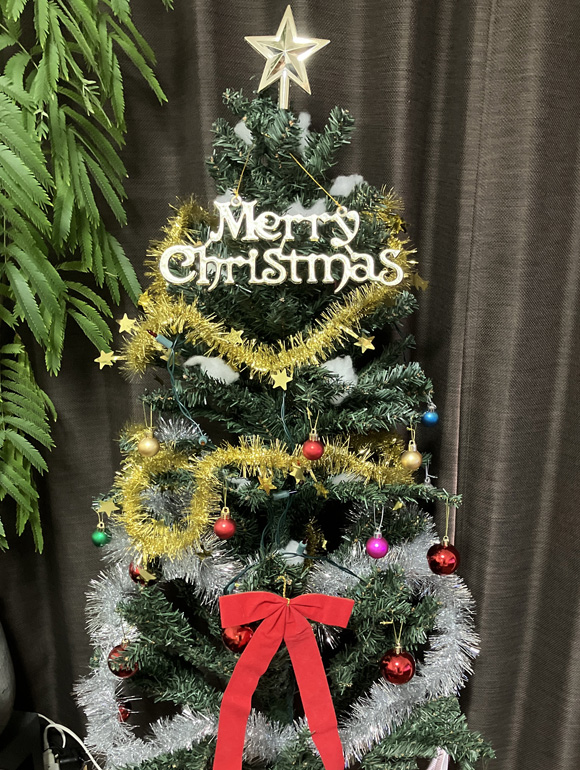 夕方の散歩から帰ると、ツリーに灯りが付いていて、とてもきれいでした。