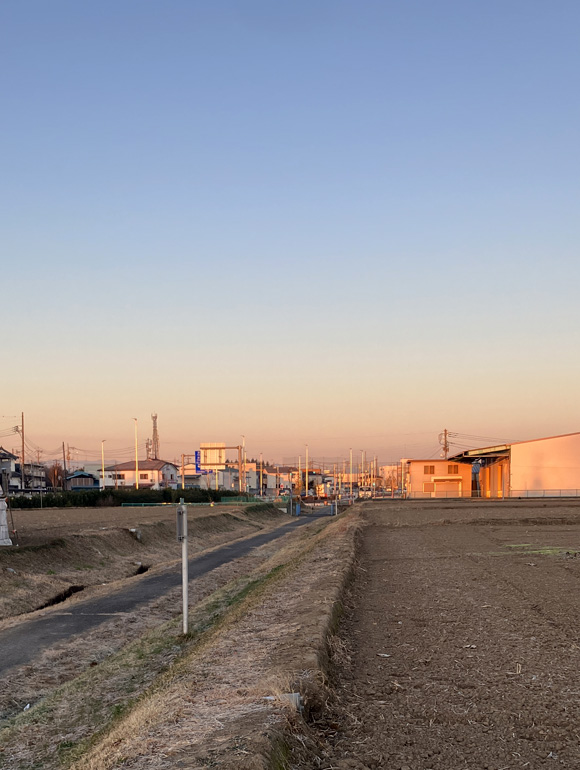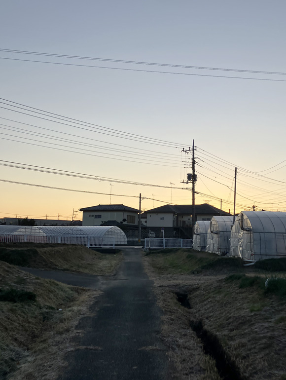 今日は畑の中の道を歩きました。反対側は徐々に朝焼けに染まっていきました