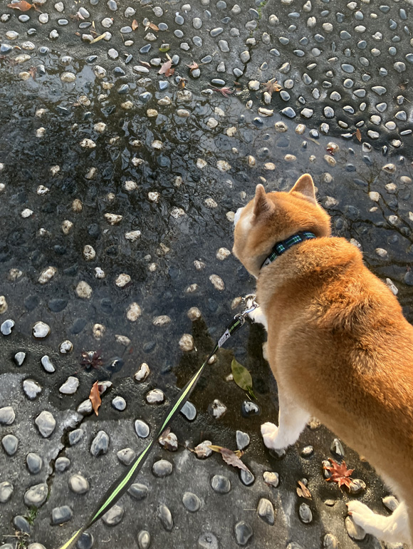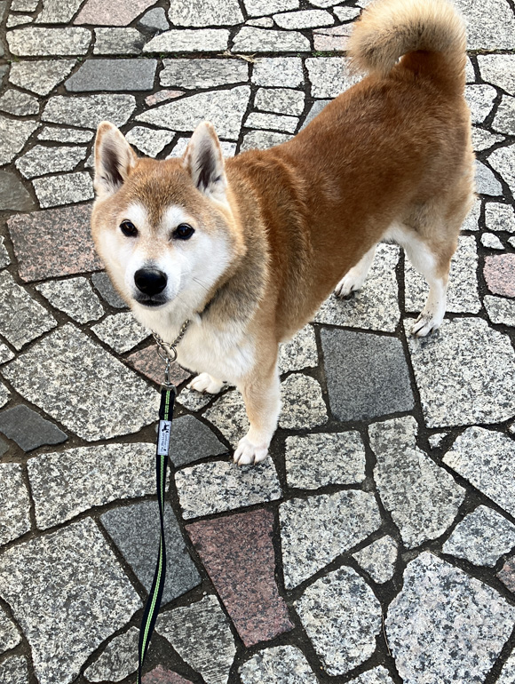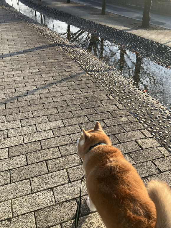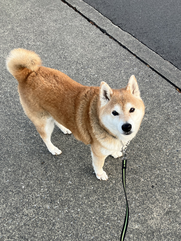 早めの散歩に、ポチはちょっとだけ戸惑いの表情を見せていました