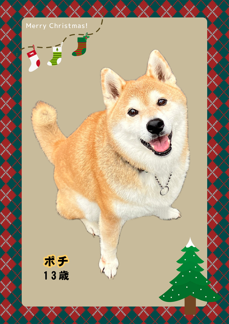 フリー素材の背景に、ポチの写真をアレンジした簡単なものですが、何となくクリスマスっぽく仕上がったと思います。