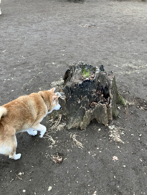 そして、ドッグランの中にある切り株の匂いを嗅ぐポチ。以前、よくこの上でオスワリしていましたが、今ではかなり朽ちていました