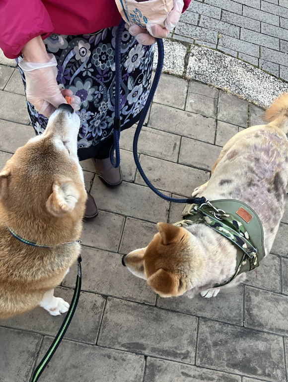 今朝は柴犬の飼い主さんからオヤツをもらうことができました。右の柴犬ですが、今月15歳になりました。最近、緑内障が進んでほぼ目が見えなくなったそうです。アトピーは以前からですが…