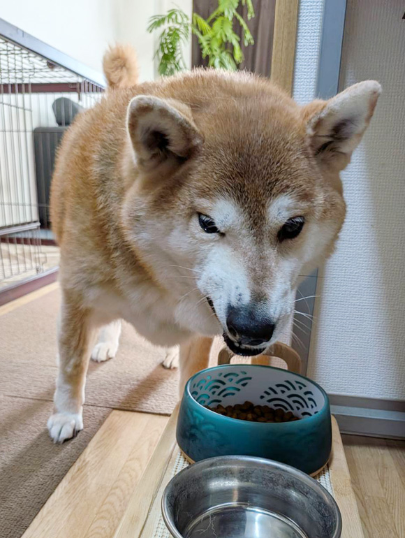ご飯を食べているポチくん、フードが歯に挟まったのかなぁ!?