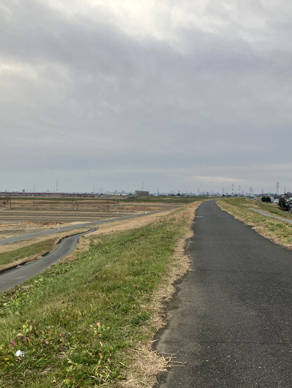 今朝は堤防のコースを散歩しました。曇り空でしたが、気温は13度台でかなり暖かかったです