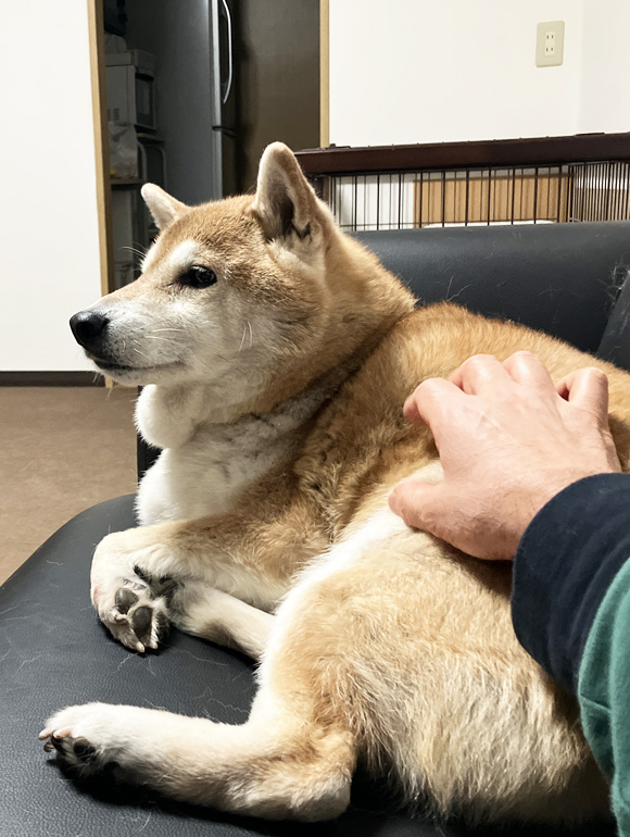 夕食後のポチ。僕の横でまったりとしていました