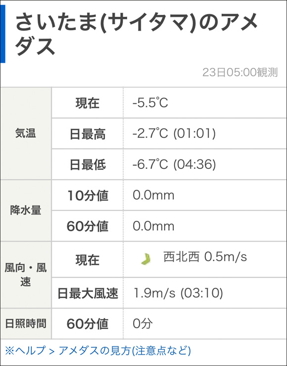 今朝5時の気温は-5.5。-7.9度はちょうど家を出た6時29分に記録されました