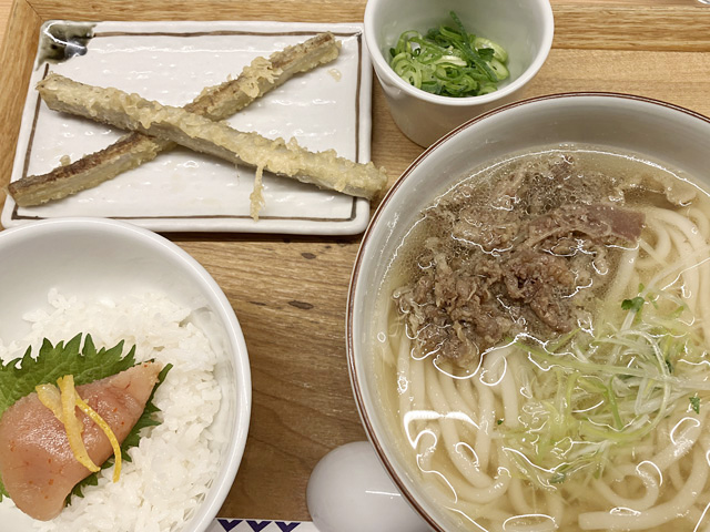 昼食は福岡空港の「博多 やりうどん 別邸」で、「肉ごぼう天うどんセット」(1,350円)をいただきました。ごぼう天が本当においしかったのと、あごだし・さば節などを使ったうどんの汁が絶品でした。明太子まで食べられて、大満足でした