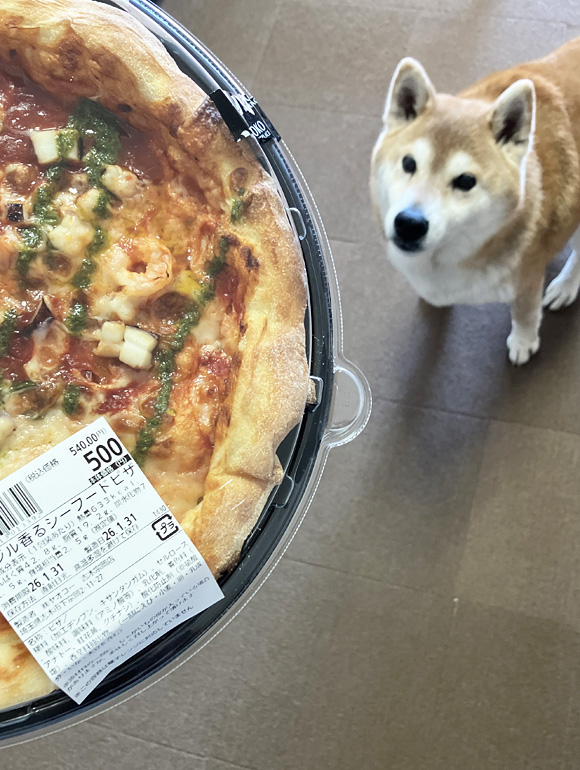 そこで今日はこの500円ピザを買って、ポチと一緒に食べました。