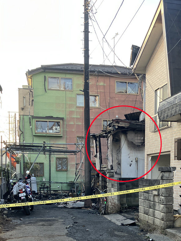 火災現場は、黄色いテープが張られていて立ち入り禁止になっていました。